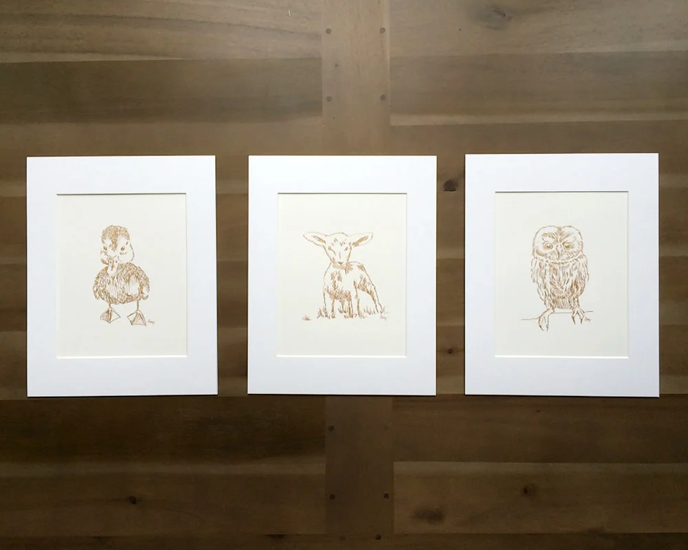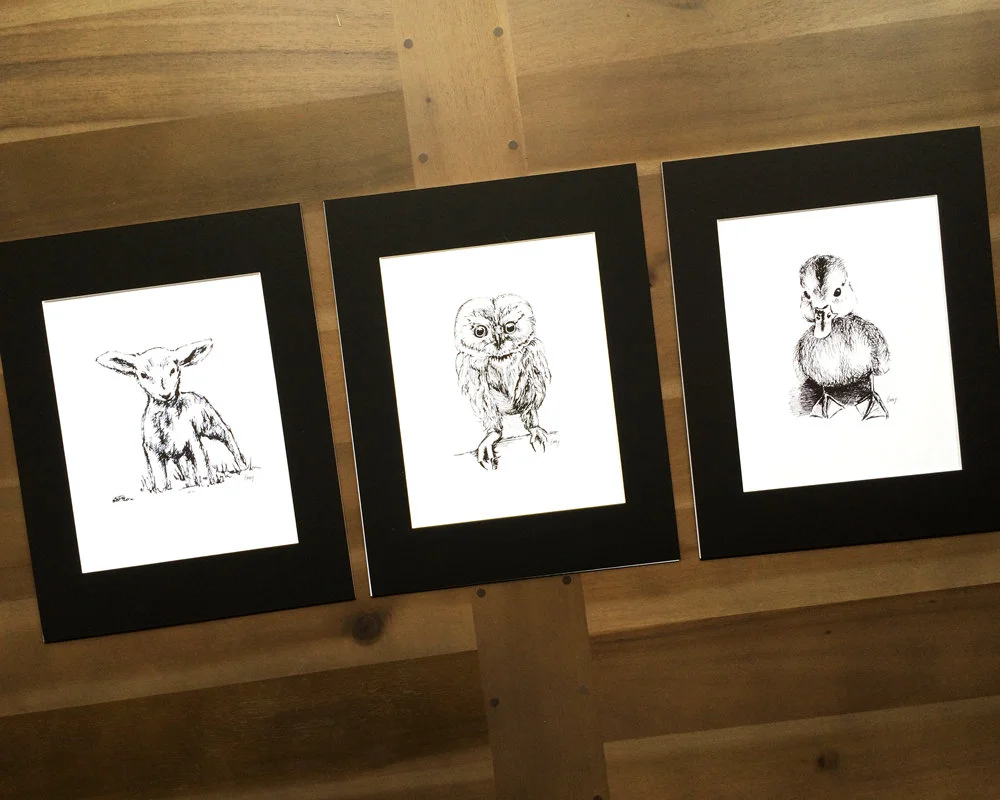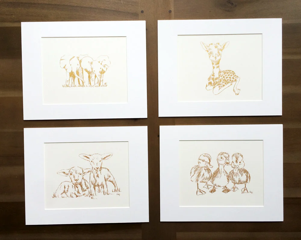These animal sketches are a great way to decorate your little one's room or to give as a gift. Black & White Animals are digital prints or you can get orignal gold ink illustrations (each one hand drawn) and come with a mat (as shown in photo) and backer for stability inside a sealed plastic sleeve. Animals (including mat) will fit in a standard 11x14 frame opening. Please specify whether you prefer a black or a white mat when you purchase in the comments section.