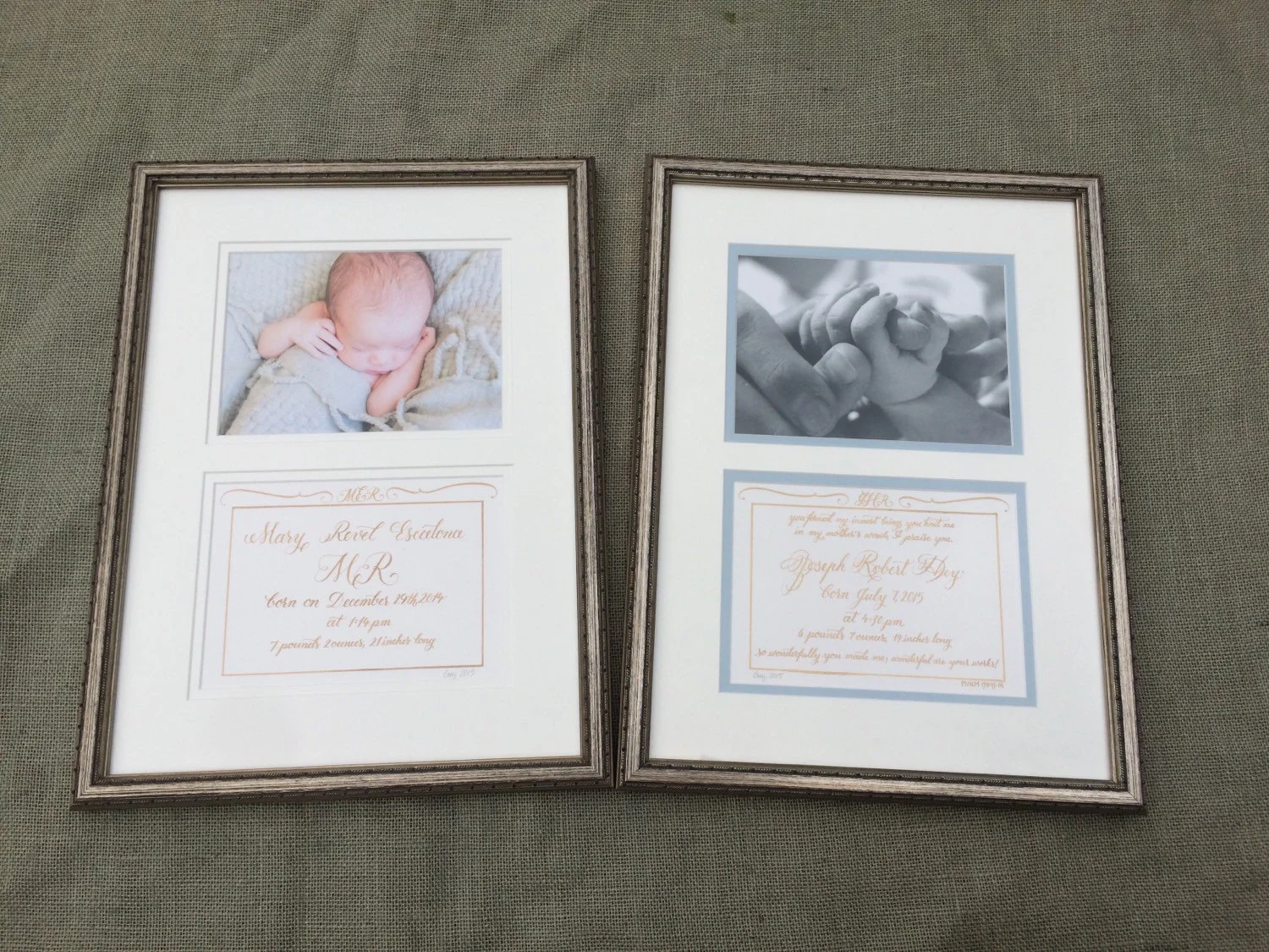 The perfect keepsake for a loved one. Your choice of a 14x16 frame with a handwritten traditional commemorative with no picture, or a 5x7 handwritten commemorative with your little one's name and stats framed along with a 5x7 photograph (provided by you) in an 11x15 custom wood frame.