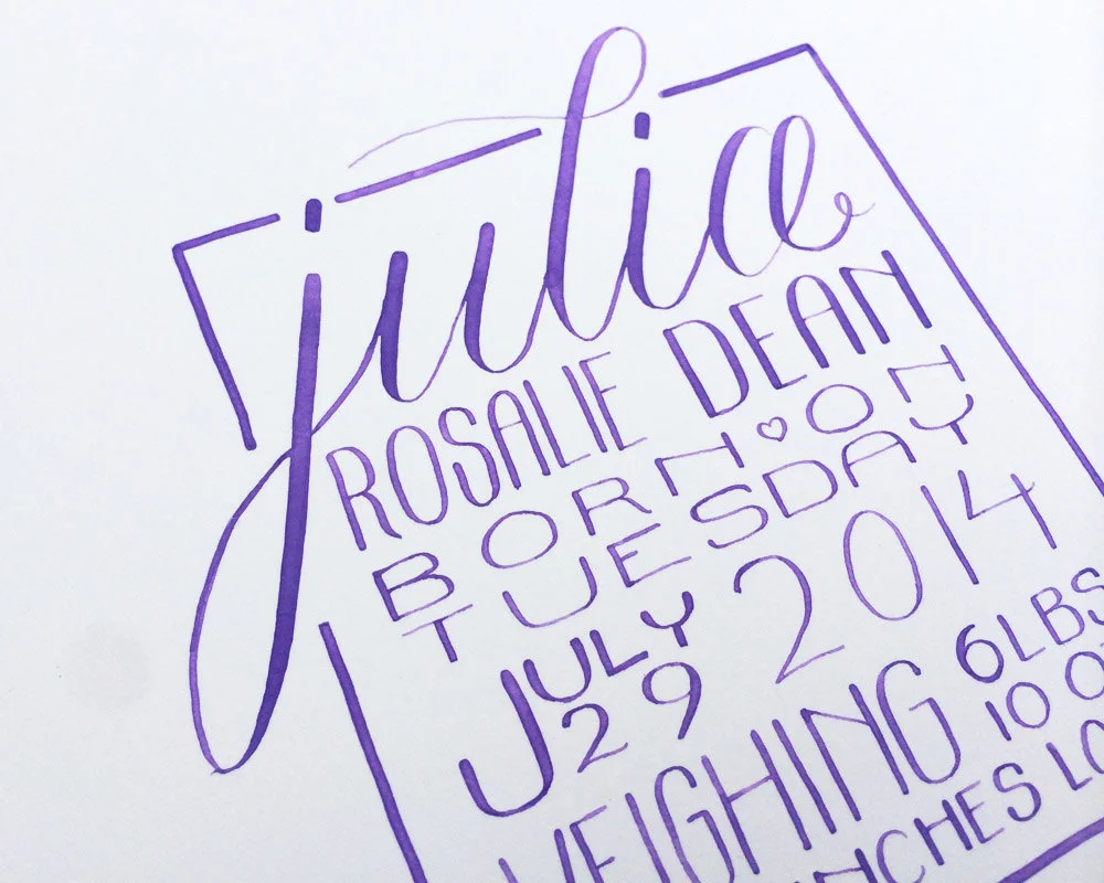These custom baby commemoratives are a great way to remember your little one's birth or a loved one's special day. These make great gifts! Each commemorative is unique and given its own flare based on the information provided. A standard commemorative will come in black and list the baby or child's name, birth date, weight and length. You can also add a custom verse or phrase for an additional cost. If you choose this option please write your verse in the comments section along with the rest of your information. Commemoratives come with a white or black conservation mat with a foam core backer for stability and are enclosed in a sealed clear sleeve. Artwork (including mat) will fit a standard 11x14 frame (frame not included). If you select the color option you will be emailed a color chart to choose your color from.